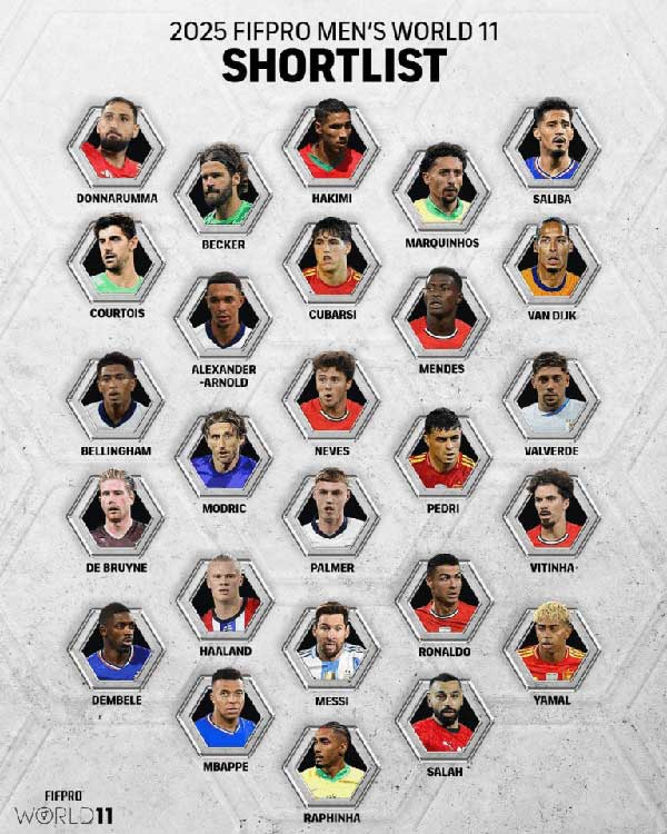 សហព័ន្ធអន្តរជាតិនៃសមាគមកីឡាករបាល់ទាត់អាជីព (FIFPRO) បានប្រកាសជាផ្លូវការអំពីបេក្ខភាពកីឡាករទាំង ២៦ នាក់ ដើម្បីប្រជែងពានជម្រើស ១១ នាក់ល្អបំផុតក្នុងពិភពលោកសម្រាប់ឆ្នាំ ២០២៥ ខណៈចំណុចគួរឱ្យចាប់អារម្មណ៍ គឺ Lionel Messi និង Cristiano Ronaldo នៅតែបន្តមានឈ្មោះ ទោះពួកគេបានចាកចេញពីបាល់ទាត់ អឺរ៉ុប ក៏ដោយ។
