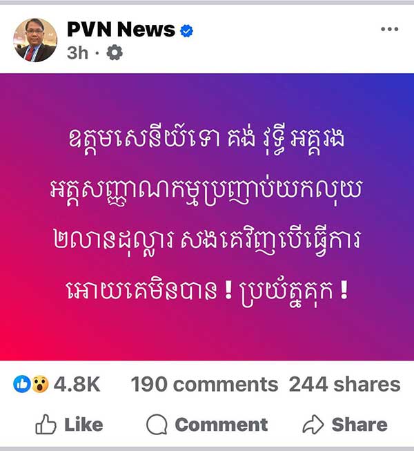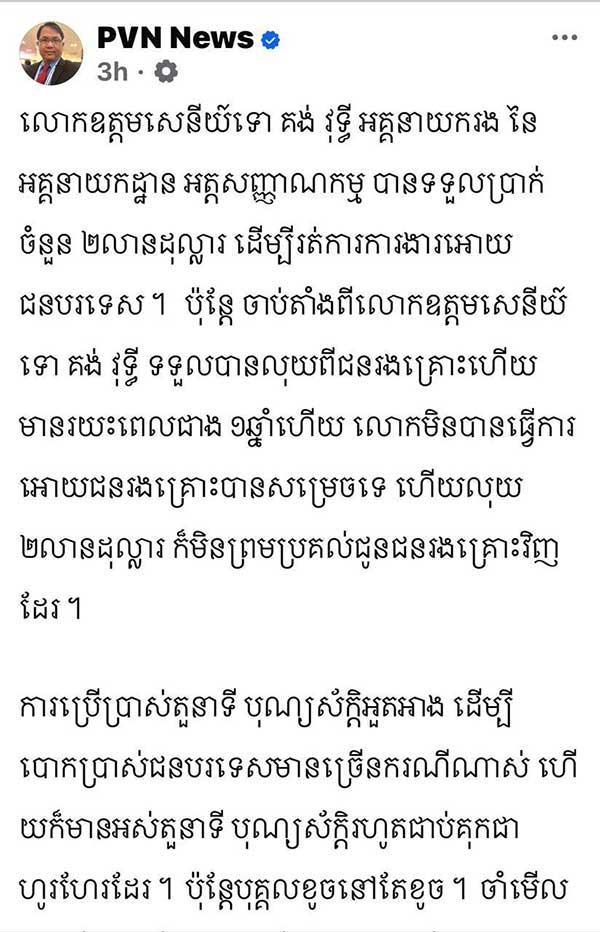 អគ្គនាយកដ្ឋានអត្តសញ្ញាណកម្ម សូមថ្លែងអំណរគុណចំពោះសារព័ត៌មាន PVN News ដែលបានលើកឡើងអំពីករណី ឯកឧត្តម ឧត្តមសេនីយ៍ទោ គង់ វុទ្ធី អគ្គនាយករង នៃអគ្គនាយកដ្ឋានអត្តសញ្ញាណកម្ម ថាបានទទួលប្រាក់រត់ការចូលសញ្ចាតិឱ្យជនបរទេសមិនបានសម្រេច ហើយមិនព្រមប្រគល់ប្រាក់ជូនជនរងគ្រោះវិញ។