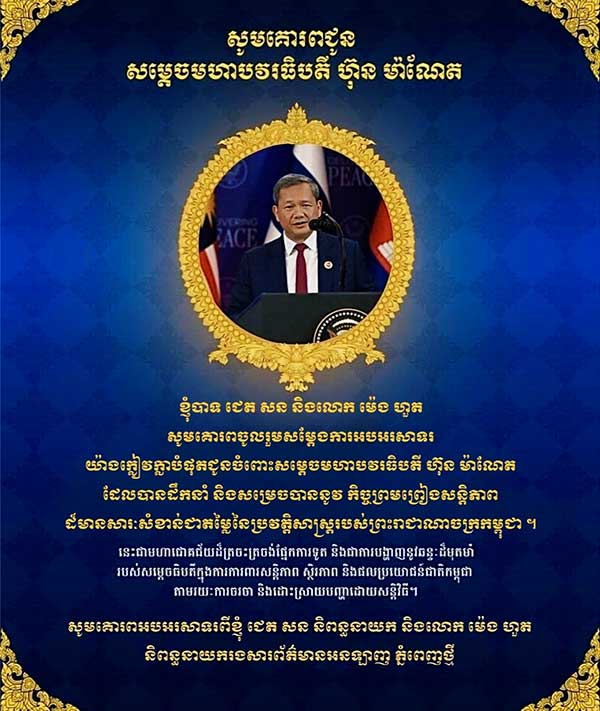 ខ្ញុំបាទ ជេត សន និពន្ធនាយក លោក ម៉េង ហ៊ួត និពន្ធនាយករង និងសហការីនៃសារព័ត៌មាន “ ភ្នំពេញថ្មី” សូមគោរពចូលរួមសម្ដែងការអបអរសាទរយ៉ាងក្លៀវក្លាជូនចំពោះសម្ដេចមហាបវរធិបតី ហ៊ុន ម៉ាណែត ដែលបានដឹកនាំនិង សម្រេចបាននូវ កិច្ចព្រមព្រៀងសន្តិភាព ដ៏មានសារៈសំខាន់ជាតម្លៃនៃប្រវត្តិសាស្រ្តរបស់ព្រះរាជាណាចក្រកម្ពុជា