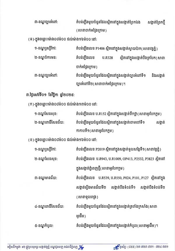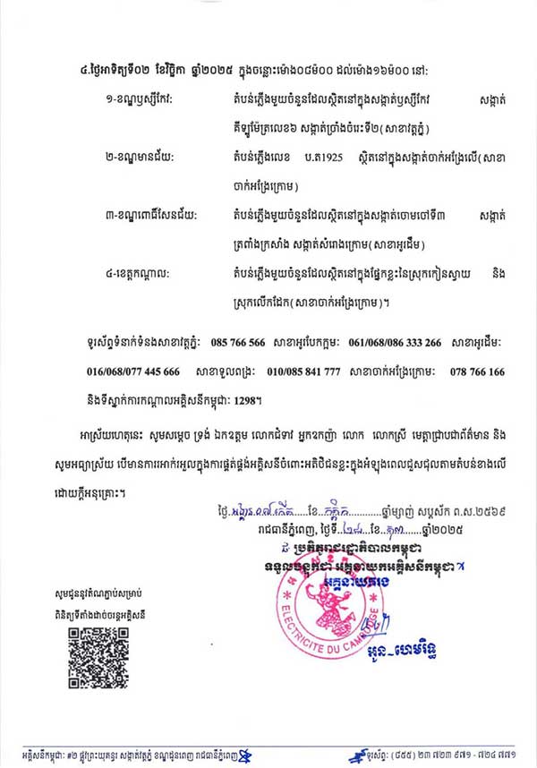 (ភ្នំពេញ)៖ អគ្គិសនីកម្ពុជា (EDC) បានចេញសេចក្តីជូនដំណឹង ស្តីពីការអនុវត្តការងារជួសជុល ផ្លាស់ប្តូរដំឡើងបរិក្ខារនានា និងរុះរើគន្លងខ្សែបណ្តាញ អគ្គិសនីរបស់អគ្គិសនីកម្ពុជា ដើម្បីបង្កលក្ខណៈងាយស្រួលដល់ការដ្ឋានពង្រីកផ្លូវ នៅថ្ងៃទី៣០ ខែតុលា ឆ្នាំ២០២៥ ដល់ថ្ងៃទី០២ ខែវិច្ឆិកា ឆ្នាំ២០២៥ នៅតំបន់មួយចំនួនទៅតាមពេលវេលា និងទីកន្លែងដូចសេចក្តីជូនដំណឹងលម្អិតខាងក្រោម។