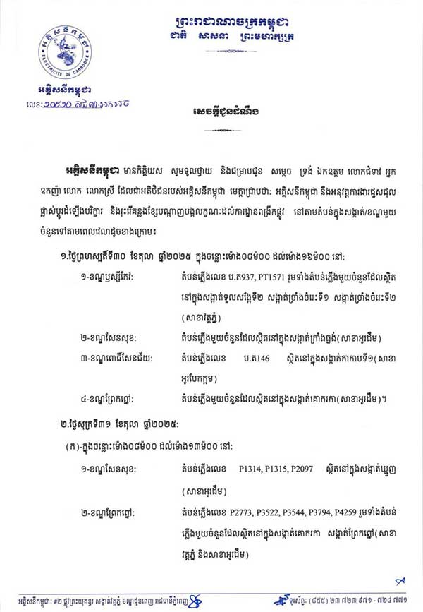 សូមអានសេចក្តីជូនដំណឹង របស់អគ្គិសនីកម្ពុជា ដូចខាងក្រោម ៖