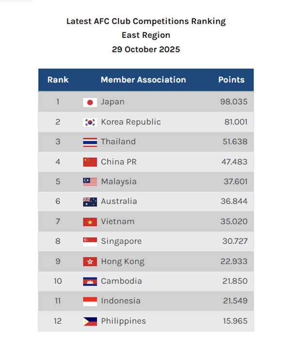 តារាងចំណាត់ថ្នាក់របស់ក្លិបកម្ពុជា ក្នុងតារាង AFC សម្រាប់តំបន់ អាស៊ីខាងកើត បានប្រែប្រួល ដោយបានហក់ឡើងមកលើ ឥណ្ឌូណេស៊ី វិញ បន្ទាប់ពី ភ្នំពេញក្រោន និងព្រះខ័នរាជស្វាយរៀង ឈ្នះដូចគ្នានៅក្នុងការប្រកួតពាន AFC Challenge League កាលពីថ្ងៃ ពុធ ទី ២៩ ខែ តុលា ឆ្នាំ ២០២៥ ។ នេះបើយោងតាម Footy Rankings។