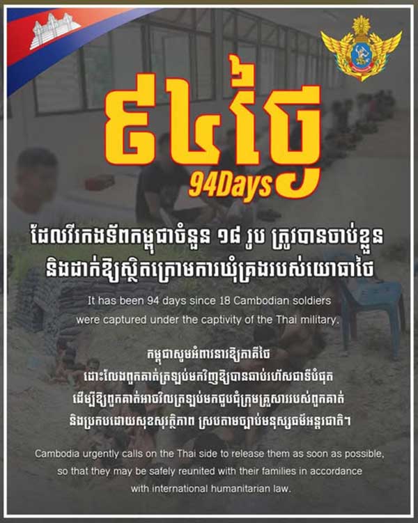 ថ្ងៃនេះជា ថ្ងៃទី៩៤ហើយ ដែលវីរកងទ័ពកម្ពុជាចំនួន ១៨រូប ត្រូវបានចាប់ខ្លួន និងដាក់ឱ្យស្ថិតក្រោមការឃុំគ្រងរបស់យោធាថៃ។