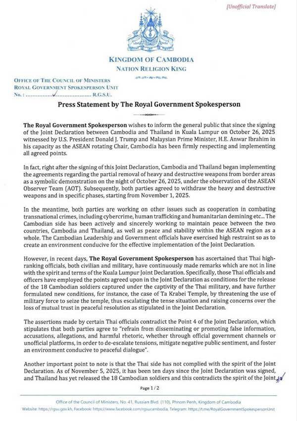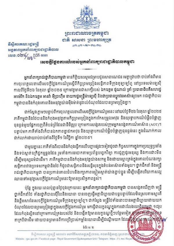 លោក ប៉ែន បូណា អ្នកនាំពាក្យរាជរដ្ឋាភិបាលកម្ពុជាបាន​លើក​ឡើង​ថា​ថៃ​កំពុង​បង្ហាញ​សកម្មភាព​បំពាន​លើ​កិច្ច​ព្រមព្រៀង​សន្ដិភាព​ជាមួយ​កម្ពុជា​ បង្ក​ឱ្យ​បាត់បង់​ទំនុក​ចិត្ត​ក្នុង​ការ​ដោះស្រាយ​បញ្ហា​ដោយ​សន្ដិវិធី។ ផ្តើមពីនោះ លោក​បាន​ទទូច​ឱ្យ​ភាគី​ថៃ​គោរព​ឱ្យ​បាន​ម៉ឺងម៉ាត់​ចំពោះ​អ្វីដែល​ខ្លួន​បាន​សន្យា​ក្នុង​សេចក្ដី​ថ្លែង​ការណ៍​រួម​ទី​ក្រុង​គូឡាឡាំពួរ។