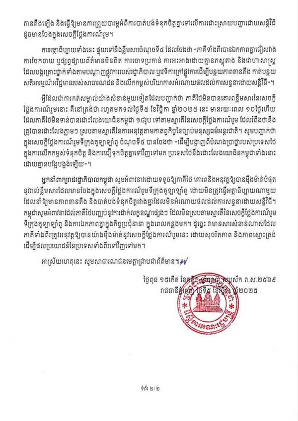 អ្នក​នាំពាក្យ​រាជរដ្ឋាភិបាល​កម្ពុជា​អំពាវ​នាវ​ដល់​ថៃ​ឱ្យ​គោរព​ឱ្យ​បាន​ម៉ឺងម៉ាត់​រាល់​ខ្លឹម​សារ​ដែល​បាន​ចុះ​ហត្ថលេខា​ជាមួយ​កម្ពុជា សូម​បង្ហាញ​នូវ​សុចរិភាព និង​ភាព​ស្មោះត្រង់​ដើម្បី​ផល​ប្រយោជន៍​នៃ​ប្រទេស​ទាំង​ពីរ​៕