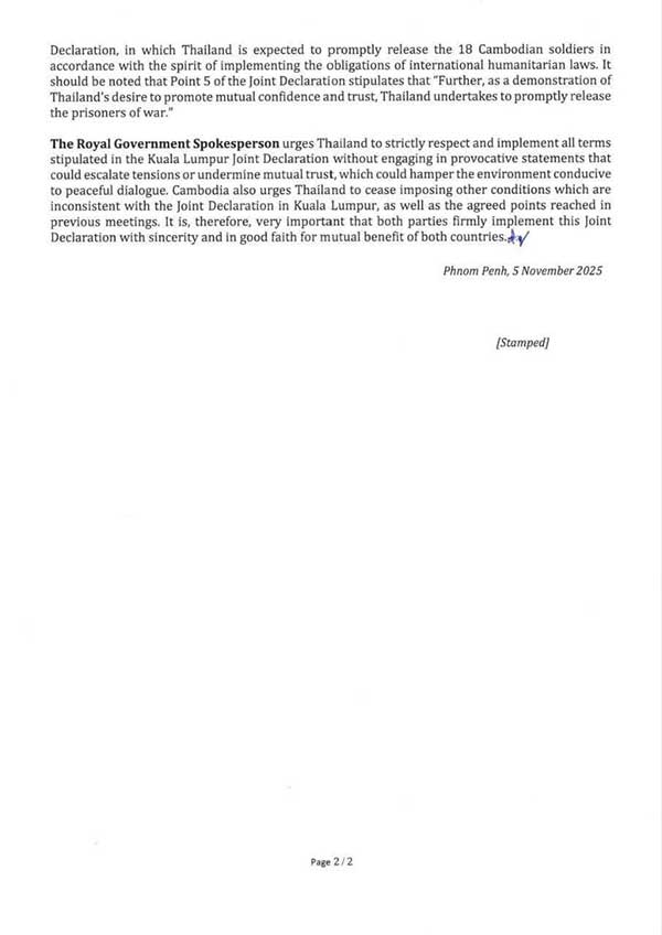 អ្នកនាំពាក្យរូបនេះ​ក៏​បាន​កត់​សម្គាល់​ផងដែរ​ថា​ តាំង​ពី​សម្រេច​បាន​នូវ​សេចក្ដីថ្លែង​ការណ៍​រួម​ដែល​មាន​ចំណុច​មួយ​គឺទាក់ទង​នឹង​ការ​ដោះលែង​ទាហាន​ខ្មែរ​ទាំង​១៨​នាក់​មក​វិញ​រហូត​មក​ដល់​ពេល​នេះ​ថៃ​នៅ​មិនគោរព​ខ្លឹមសារ​នៃ​សេចក្ដី​ថ្លែង​ការណ៍​រួម​នោះ​ទេ។