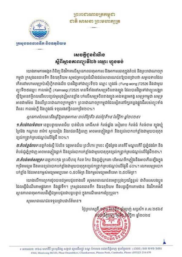 ក្រសួងធនធានទឹក និងឧតុនិយម ចេញសេចក្តីជូនដំណឹង ស្តីពីសម្ពាធទាបដែលកើតនៅមហាសមុទ្រប៉ាស៊ីហ្វិកខាងលិច បានវិវត្តទៅជាព្យុះទី២៦ ឈ្មោះ ហ្វុងវង់ (Fung-wong)T2526 និងជាមួយព្យុះទី២៥ឈ្មោះ កាលម៉េហ្គី (Kalmaegi)T2525។ កម្ពុជាដែលស្ថិតនៅក្បែរគន្លងផ្លូវដើររបស់ព្យុះទាំងពីរនេះ កាលម៉េហ្គី និងហ្វុងវង់ ទទួលរងឥទ្ធិពលកម្រិត២០% ចន្លោះចាប់ពីថ្ងៃទី០៦ ដល់ថ្ងៃទី១៥ ខែវិច្ឆិកា ឆ្នាំ២០២៥។