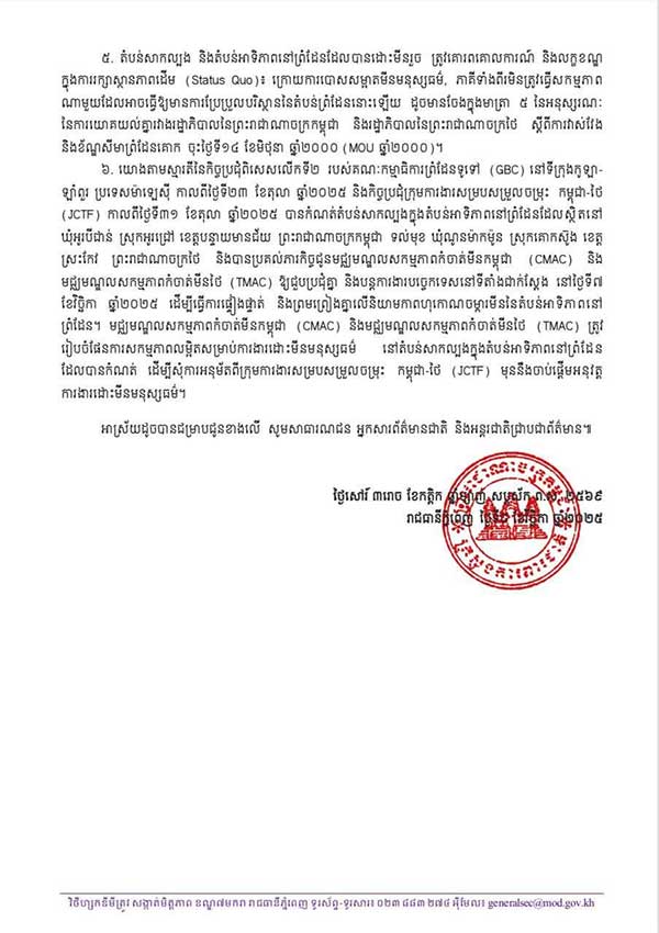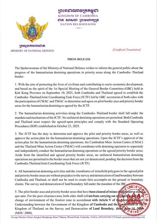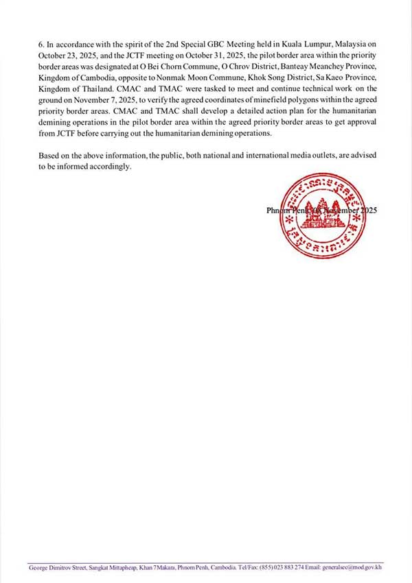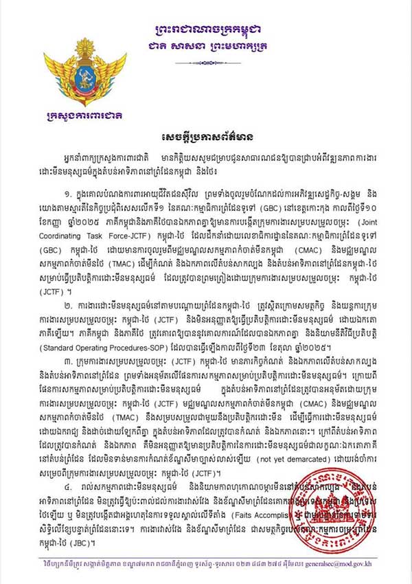 ក្រសួងការពារជាតិចេញសេចក្តីប្រកាសព័ត៌មានអំពី វឌ្ឍនភាពការងារដោះមីនមនុស្សធម៌ក្នុងតំបន់អាទិភាពនៅព្រំដែនកម្ពុជា-ថៃ