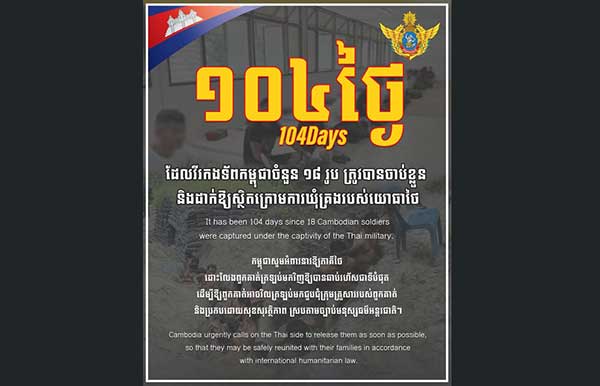 ថ្ងៃនេះជា ថ្ងៃទី១០៤ហើយ ដែលវីរកងទ័ពកម្ពុជាចំនួន ១៨រូប ត្រូវបានចាប់ខ្លួន និងដាក់ឱ្យស្ថិតក្រោមការឃុំគ្រងរបស់យោធាថៃ។