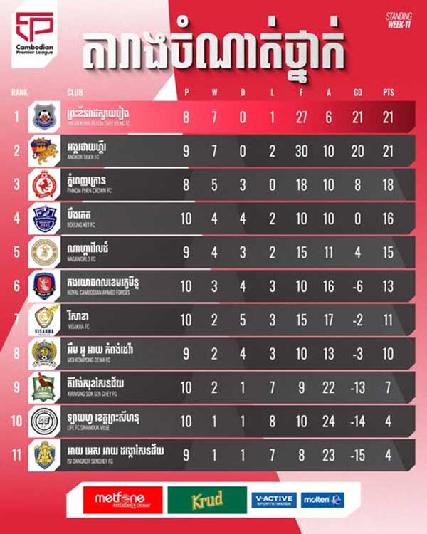 ឆ្លងកាត់ ៨ ប្រកួត ព្រះខ័នរាជស្វាយរៀង ឈ្នះ ៧ និងចាញ់ ១ រកបាន ២១ ពិន្ទុ កំពុងឈរលើកំពូលតារាង។ ជាមួយគ្នានេះ ក្រុមអង្គរថាយហ្គឺរ ក៏បង្កការចាប់អារម្មណ៍ដែរដោយបានឈរលេខ២ ដោយមាន ២១ ពិន្ទុស្មើ នឹងព្រះខ័នរាជស្វាយរៀង ដែរ ប៉ុន្តែពួកគេបានប្រកួត ៩ លើក គឺឈ្នះ ៧ និងចាញ់ ២៕