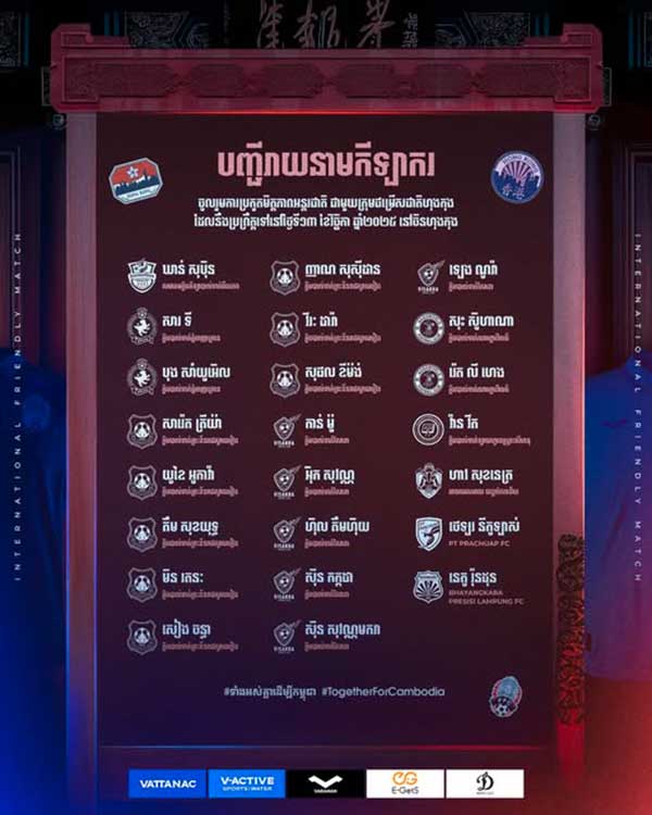 សហព័ន្ធកីឡាបាល់ទាត់កម្ពុជា នៅមុននេះ បានបង្ហាញបញ្ជីរាយនាមកីឡាករជម្រើសជាតិកម្ពុជាចូលរួមការប្រកួតមិត្តភាពអន្តរជាតិជាមួយចិនហុងកុង Hong Kong, China ដែលនឹងប្រព្រឹត្តទៅនៅថ្ងៃទី១៣ ខែវិច្ឆិកា ឆ្នាំ២០២៥ នៅទីក្រុងចិនហុងកុង។