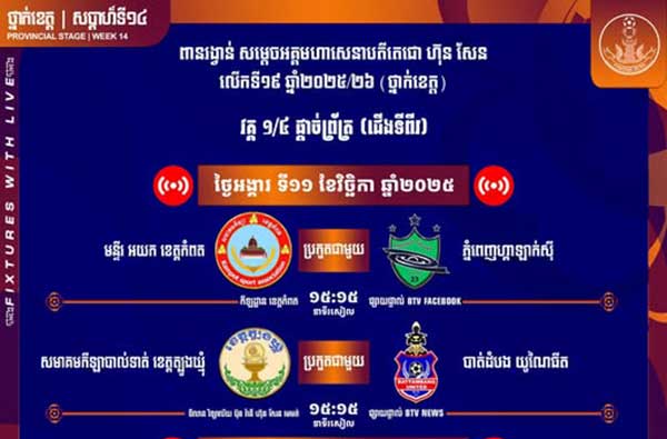 ការប្រកួតពានរង្វាន់ សម្តេចអគ្គមហាសេនាបតីតេជោ ហ៊ុន សែន លើកទី១៩ ឆ្នាំ២០២៥/២៦ (ថ្នាក់ខេត្ត) បានឈានចូលជើងទី២ វគ្គ ១/៤ ផ្តាច់ព្រ័ត្រហើយ ដើម្បីសម្រេចថាក្រុមណានឹងឡើងវគ្គពាក់កណ្ដាលផ្ដាច់ព្រ័ត្រ ដោយនៅថ្ងៃទី១១ ខែវិច្ឆិកា ឆ្នាំ២០២៥នេះ មាន២គូគឺ
