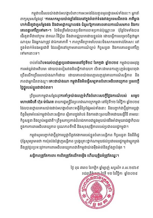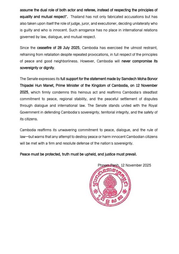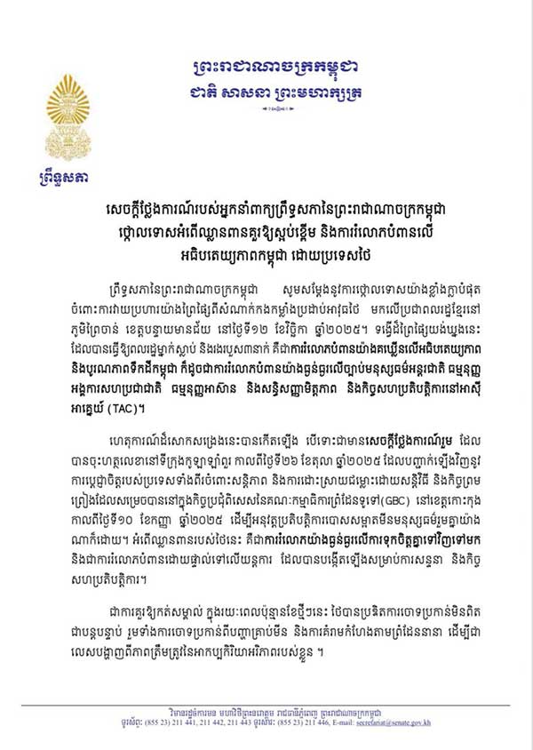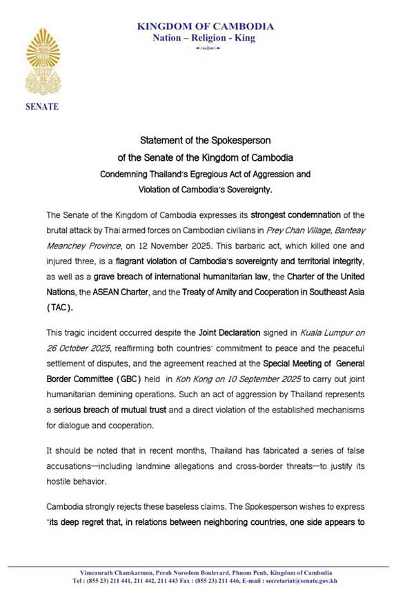 សេចក្តីថ្លែងការណ៍របស់អ្នកនាំពាក្យព្រឹទ្ធសភានៃព្រះរាជាណាចក្រកម្ពុជា ថ្កោលទោសយ៉ាងខ្លាំងក្លាបំផុត ចំពោះការវាយប្រហារយ៉ាងព្រៃផ្សៃពីសំណាក់កងកម្លាំងប្រដាប់អាវុធថៃ មកលើប្រជាពលរដ្ឋខ្មែរ នៅភូមិព្រៃចាន់ ខេត្តបន្ទាយមានជ័យ នៅថ្ងៃទី១២ ខែវិច្ឆិកា ឆ្នាំ២០២៥