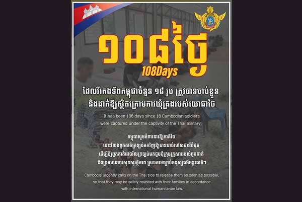 ថ្ងៃនេះជា ថ្ងៃទី១០៨ ហើយ ដែលវីរកងទ័ពកម្ពុជាចំនួន ១៨រូប ត្រូវបានចាប់ខ្លួន និងដាក់ឱ្យស្ថិតក្រោមការឃុំគ្រងរបស់យោធាថៃ។