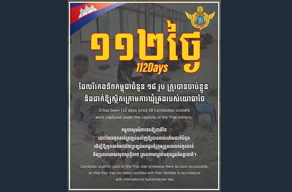 ថ្ងៃនេះជា ថ្ងៃទី១១២ ហើយ ដែលវីរកងទ័ពកម្ពុជាចំនួន ១៨រូប ត្រូវបានចាប់ខ្លួន និងដាក់ឱ្យស្ថិតក្រោមការឃុំគ្រងរបស់យោធាថៃ។