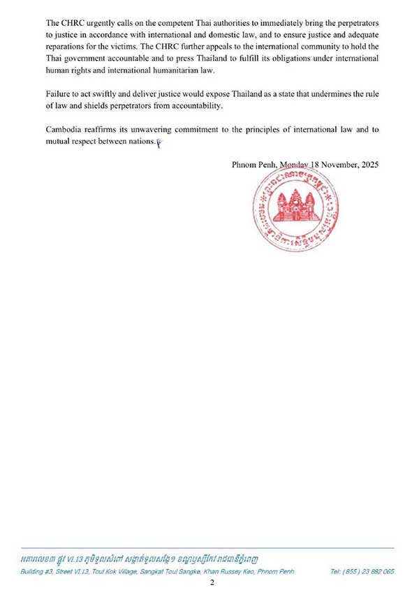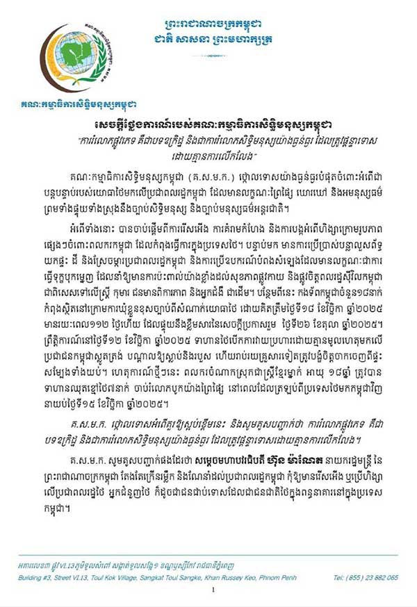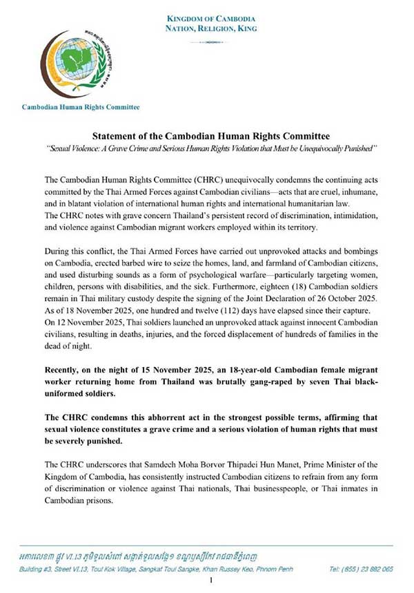 គណៈកម្មាធិការសិទ្ធិមនុស្សកម្ពុជា ៖ ការរំលោភផ្លូវភេទ គឺជាបទឧក្រិដ្ឋ និងជាការរំលោភសិទ្ធិមនុស្សយ៉ាងធ្ងន់ធ្ងរ ដែលត្រូវផ្តន្ទាទោសដោយគ្មានការលើកលែង