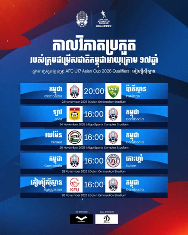 កម្មវិធីប្រកួតវគ្គជម្រុះប្រកួត AFC U17 Asian Cup Saudi Arabia 2026 ឃើញថាក្រុមជម្រើសជាតិយុវជនអាយុក្រោយ ១៧ឆ្នាំកម្ពុជា នឹងត្រូវប៉ះក្រមប៉ាគីស្ថាន មុនគេនៅថ្ងៃទី២២ ខែវិច្ឆិកានេះ ដែលការលេងវគ្គជម្រុះចាប់ពីថ្ងៃទី២២ ដល់ថ្ងៃទី៣០ ខែដដែលនេះ នៅទីក្រុងប៊ីស្កេក ប្រទេសកៀហ្ស៊ីស៊ីស្ថាន ។