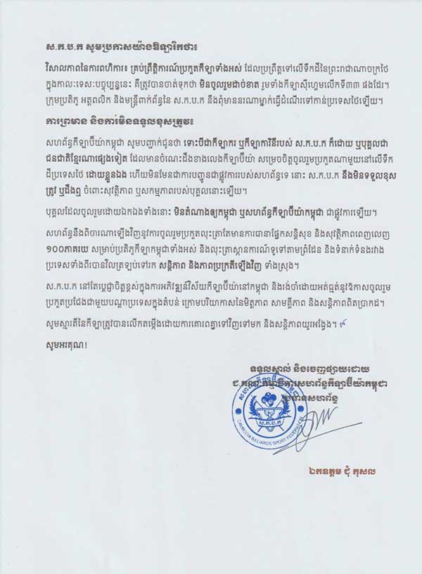 សូមអានសេចក្ដីសម្រេចរបស់សហព័ន្ធកីឡាប៊ីយ៉ាកម្ពុជាខាងក្រោមនេះ៖