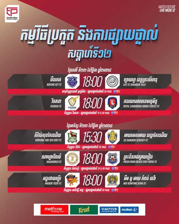 ​កម្មវិធីប្រកួតលីគកំពូលកម្ពុជា សម្រាប់សប្តាហ៍ទី១២