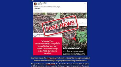 ខ្លឹមសារដែលបានបង្ហោះ គឺជាព័ត៌មានក្លែងក្លាយ! កងទ័ពកម្ពុជាប្រកាន់ខ្ជាប់នូវវិន័យ និងអនុវត្តតាមបទឈប់បាញ់ជាប់លាប់ហើយមិនមានជាប់ពាក់ព័ន្ធនឹងការលួចបង្កប់គ្រាប់មីនដូចការចោទប្រកាន់ពីភាគីថៃនោះទេ