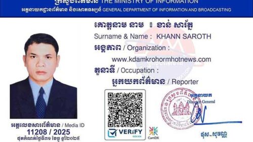 ក្រសួងព័ត៌មានលុបចោលសុពលភាពនៃប័ណ្ណសម្គាល់អត្តសញ្ញាណជាអ្នកសារព័ត៌មានរបស់បុគ្គលឈ្មោះ ខាន់ សារ័ត្ន ក្រោយពីបានរកឃើញកំហុសឆ្គងវិជ្ជាជីវៈធ្ងន់ធ្ងរ